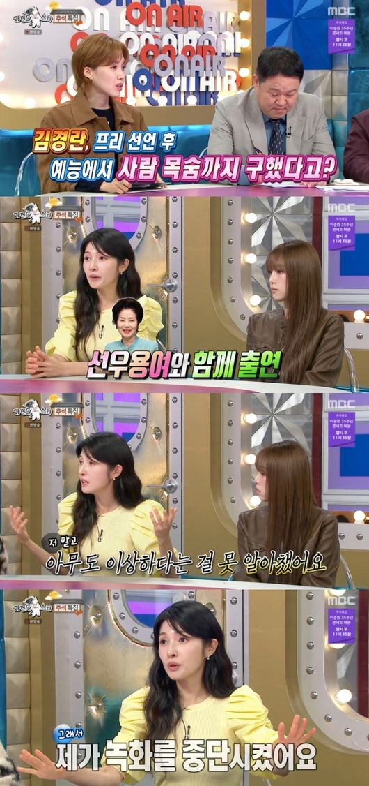 이날 김경란은 프리 선언 후 예능에서 누군가의 목숨을 구했다고 알려져 궁금증을 모았다. 그는 “당시 건강 프로그램이었는데 의사 선생님도 많이 계셨다. 방청객도 계시고, 큰 프로그램이었는데 선우용여 선생님이 계셨다. 제가 질문을 해서 넘겼는데 약간 다른 이야기를 하시더라”라고 회상했다.