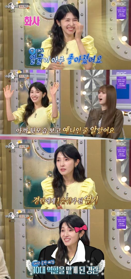 이후 김경란은 “작년부터 제 삶의 1순위는 연기로 바꿨다”라며 “재밌는 건 어제 다음 작품과 관련해서 미팅을 했는데 내년에 10대 역할을 맡게 됐다”라고 자랑했다. 그 말에 김구라는 “뒷모습 보니까 10대던데”라고 응원했다.