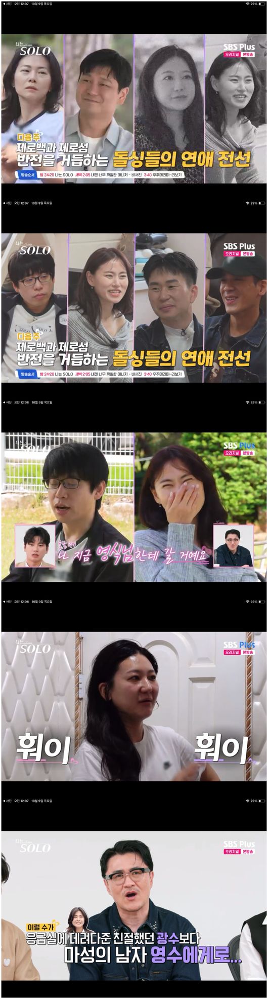 8일 방영된 SBS 예능 ‘나는 SOLO - 나는 솔로’(이하 ‘나는 솔로’)에서는 여성 선택 2순위 데이트가 시작되었다. 영호는 정희와, 광수는 영숙과 데이트를 나갔다. 정희의 차분하고도 사려 깊은 말솜씨에 영호는 꽤 정희에게 호감을 느낀 듯했다. 다만 영호는 여전히 옥순이 1순위이므로 영수와 데이트를 나간 옥순과 대화를 해 본 후 정희에게 마음을 알려주겠노라 꾸밈 없이 말했다.