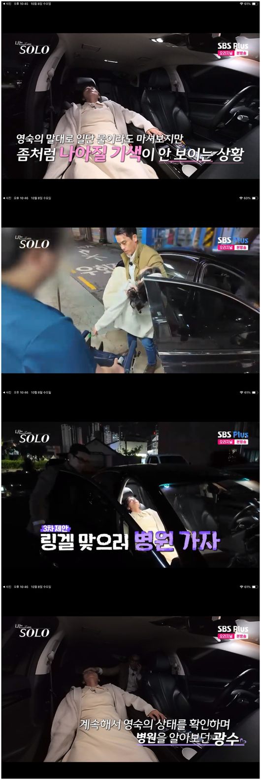 영숙은 순식간에 핏기가 사라지더니 그대로 몸이 굳었다. 알코올 쇼크였다. 광수는 결국 영숙을 안아들고 응급실을 방문해 링겔을 맞게 했다. 영숙 딴에는 광수에게 호감이 생겼으나 광수는 이 때문에 영숙에 대한 호감이 사라졌다.