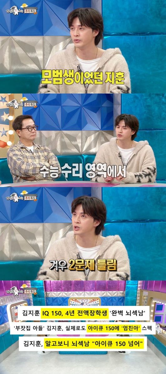 배우 김지훈이 ‘뇌섹남’의 존재감을 입증했다. 아이큐(IQ) 150에 수능에서 수리 영역도 만점에 가까운 점수를 받은 과거 이력을 공개한 것.