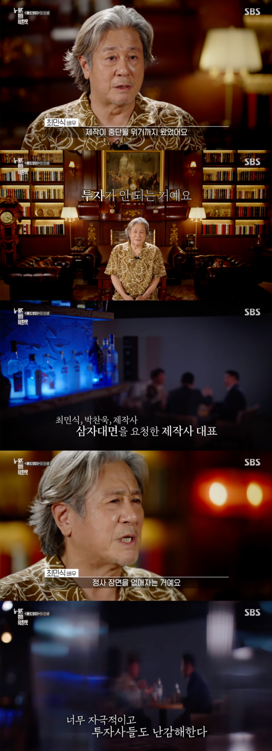 최민식은 “그 돈 빌리러 다니는 게 힘들었으면 이런 얘기까지 할까. 인간적으로 너무 안 됐는데, 박찬욱 감독 입장을 들어보면 만드는 사람 입장에서는 그게 정말 필요하거든요. 난 죽겠는 거야 가운데서”라고 회상했다.