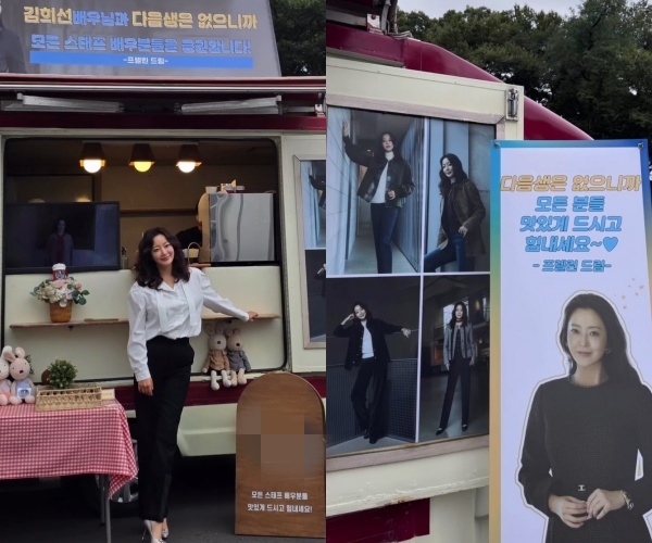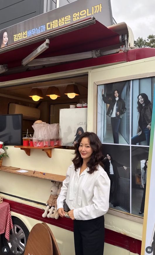 공개된 사진 속에는 김희선이 모델로 활약하는 여성 의류 브랜드 측에서 커피차를 선물한 모습이 담겨 있다. 해당 브랜드 측은 새 드라마 '다음생은 없으니까' 현장에 김희선과 제작진을 위해 커피차를 보냈고, "김희선 배우님과 다음생은 없으니까' 모든 스태프 배우분들을 응원합니다"라며 "다음생은 없으니까 모든 분들 맛있게 드시고 힘내세요♥"라는 응원 메시지를 보냈다. 이에 김희선은 커피차 앞에서 환한 미소와 다양한 포즈를 취하면서 인증샷을 찍었다.