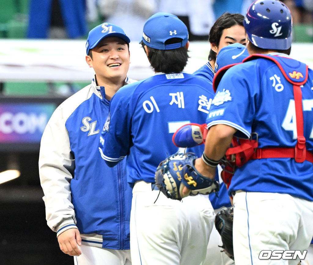 경기 종료 후 삼성 최원태가 동료들과 승리의 기쁨을 나누고 있다. 2025.10.09 /sunday@osen.co.kr