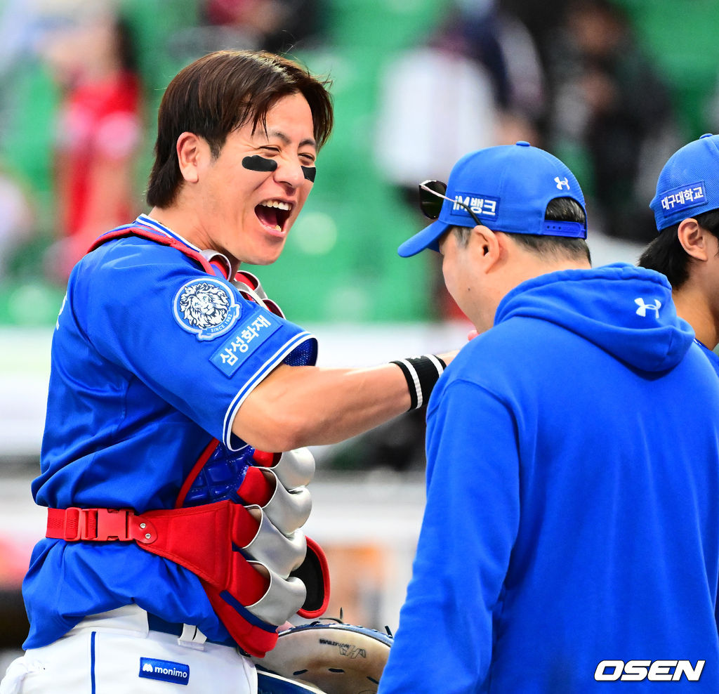 경기를 마치고 삼성 강민호가 박진만 감독과 승리 하이파이브를 하고 있다. 2025.10.09 /jpnews@osen.co.kr