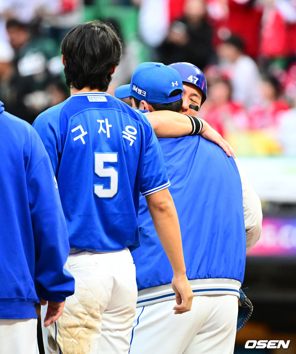 경기를 마치고 삼성 강민호가 최원태를 껴안아주고 있다. 2025.10.09 /jpnews@osen.co.kr
