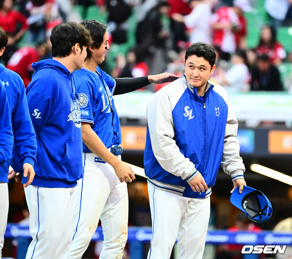 경기를 마치고 삼성 최원태가 구자욱의 승리 축하를 받고 있다. 2025.10.09 /jpnews@osen.co.kr