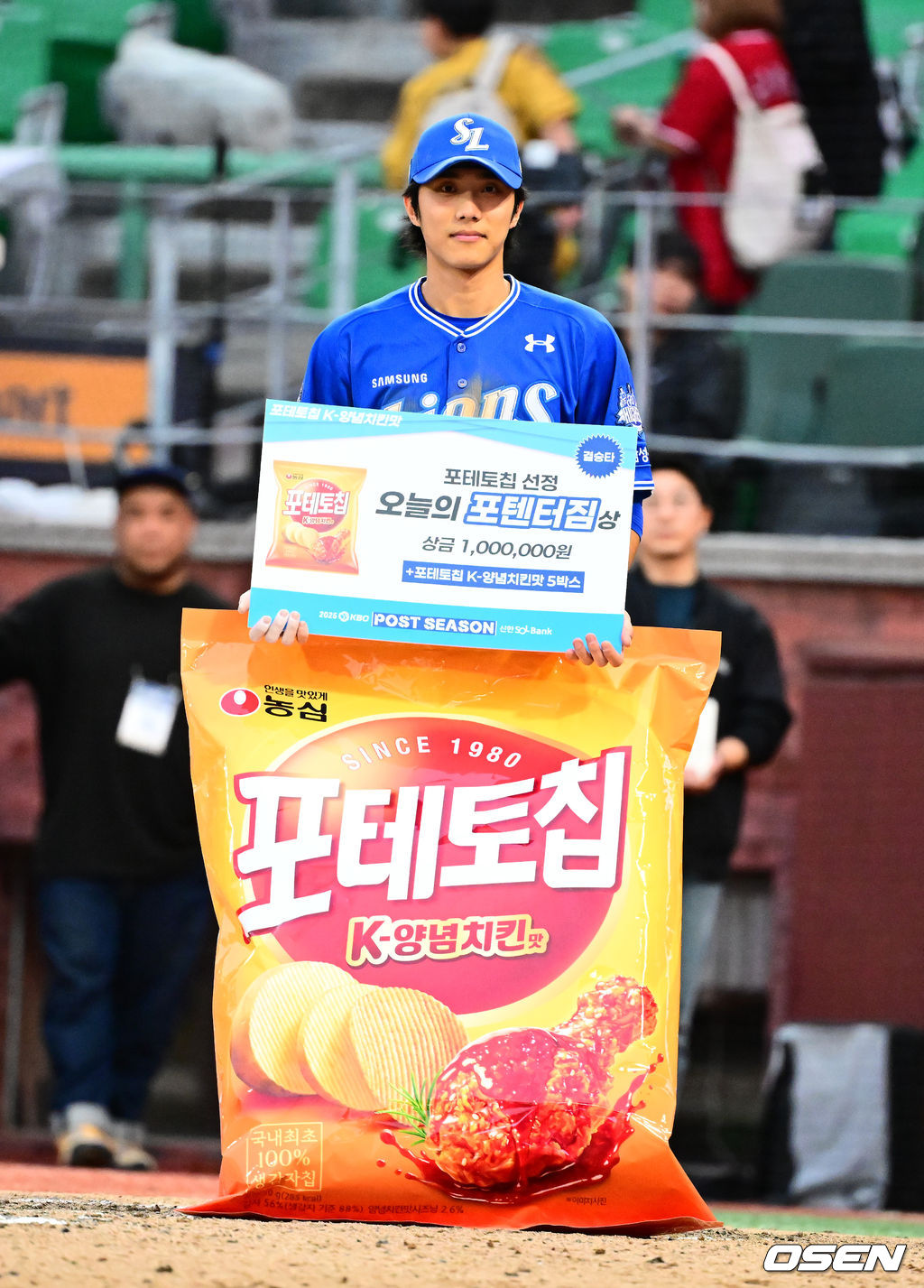 경기를 마치고 삼성 이재현이 '오늘의 포텐터짐 상'을 수상하며 기념 촬영을 하고 있다. 2025.10.09 /jpnews@osen.co.kr