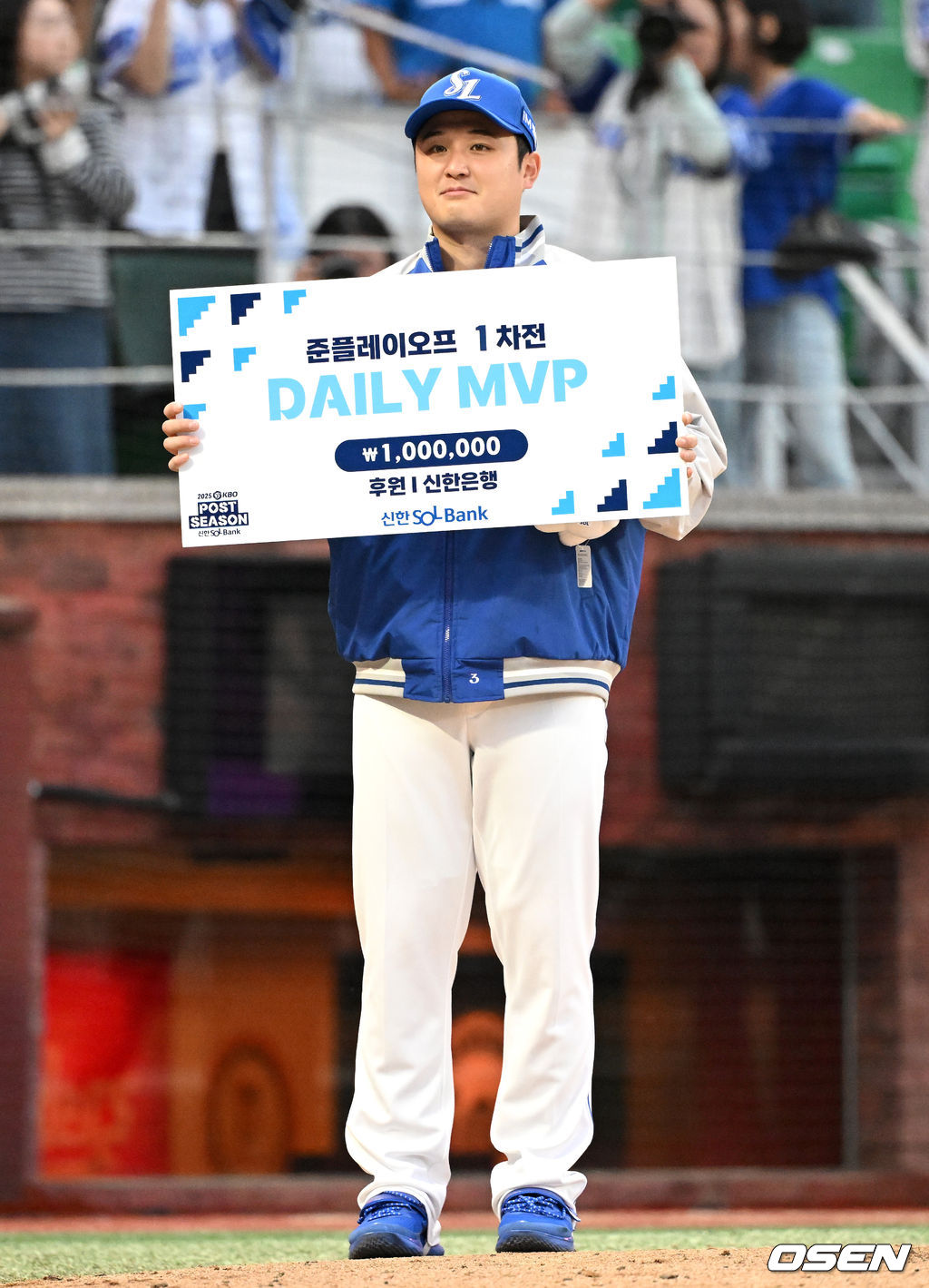 경기 종료 후 준플레이오프 1차전 MVP를 수상한 삼성 최원태가 포즈를 취하고 있다. 2025.10.09 /sunday@osen.co.kr