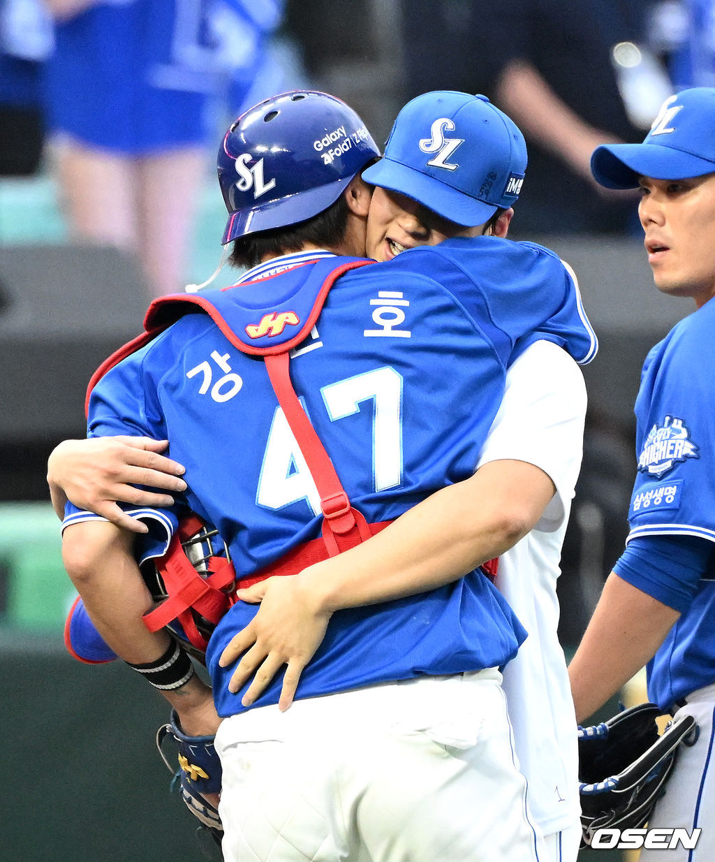 경기 종료 후 삼성 강민호와 이호성이 승리의 기쁨을 나누고 있다. 2025.10.09 /sunday@osen.co.kr