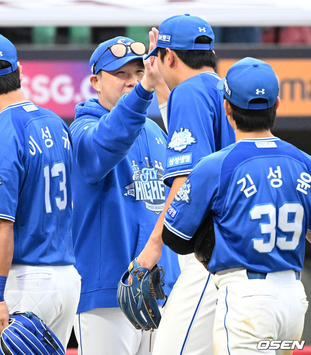 경기 종료 후 삼성 박진만 감독이 김영웅과 승리의 기쁨을 나누고 있다. 2025.10.09 /sunday@osen.co.kr