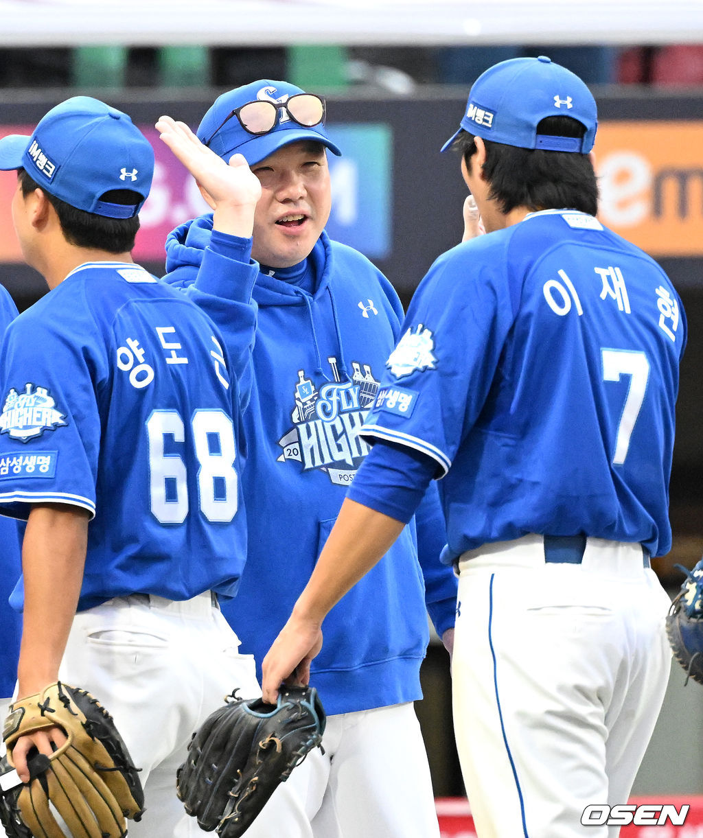 경기 종료 후 삼성 박진만 감독이 이재현과 승리의 기쁨을 나누고 있다. 2025.10.09 /sunday@osen.co.kr