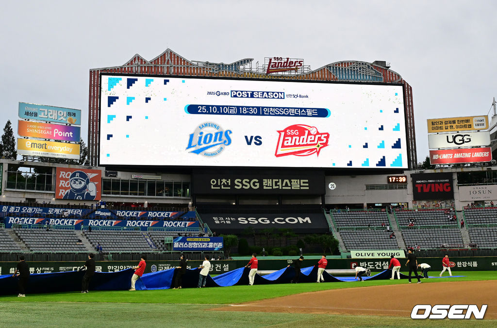 경기를 마치고 내일 비가 예보된 가운데 방수 기념 촬영을 하고 있다. 2025.10.09 /jpnews@osen.co.kr