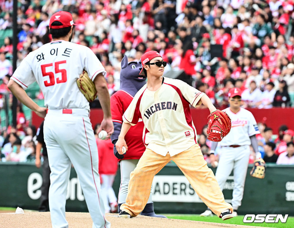 경기에 앞서 배우 최현욱이 시구를 하고 있다. 2025.10.09 /jpnews@osen.co.kr