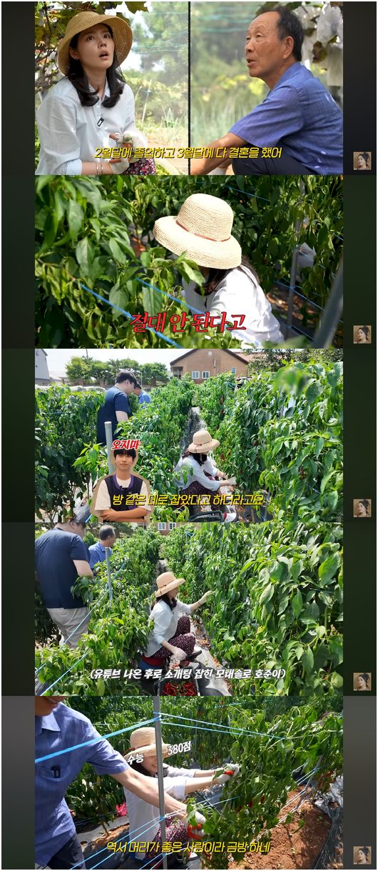 한가인은 사돈 어른이자 언니의 시댁으로 밭일을 하러 갔다. 한가인은 사돈 어른 앞에서 형부의 프러포즈 이야기를 하며 아이처럼 웃었다.