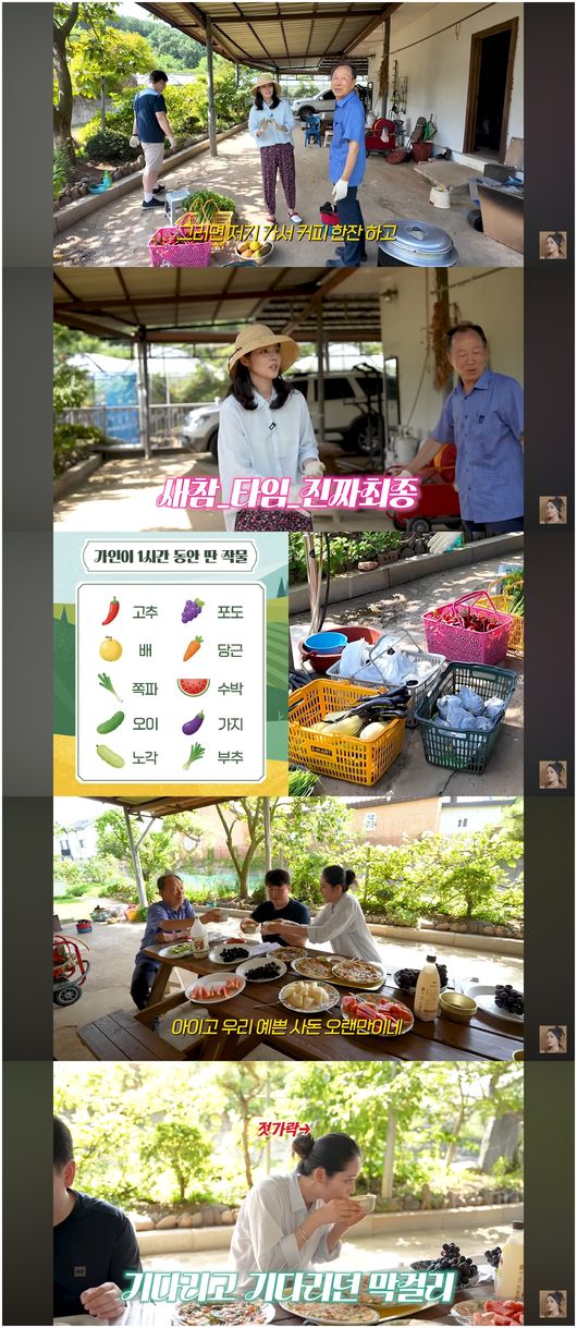 한가인은 이날 샤인머스켓, 배, 쪽파, 노각, 당근을 수확했다. 일을 마치고 나자 새참 겸 점심 잔치가 열렸다. 한가인은 나무 젓가락으로 머리를 틀어올린 채 막걸리를 시원하게 들이켰다. 방금 캔 쪽파와 부추가 듬뿍 들어간 빈대떡까지, 먹음직스럽지 않은 게 없었다.