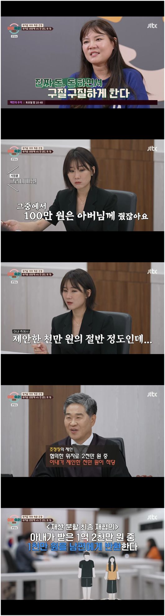 이들은 사실 사전에 재산을 합의했다. 이에 남편은 아내에게 돌연 재산 재분할을 요청했다. 4천만 원은 돌려받아야 한다는 주장이었다. 남편 측 변호사 박민철은 “재산은 상가 등 3억 원, 코인 채무, 아버님께 진 빚 등 각 1억 2천만 원씩이다”, “경제적 기여도 5:5라고 따지면 6천만 원씩 가지되 장모님께 빚을 졌으니 전체적으로 6:4로 나눠야하지 않냐”, “그리고 유책사유도 남편 쪽으로 꼭 볼 수 없다. 시아버지 부분은 서로 주장이 다르다”라며 논리 정연하게 먼저 남편 입장을 전했다.