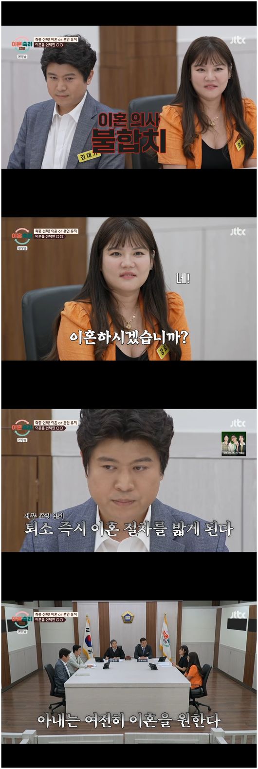 무엇보다 이들 부부는 실제 이혼 조정 기간 중이었다. 서장훈은 “남편 김대기와 아내 강효정은 실제 이혼숙려 과정으로, 이혼숙려캠프에 참가했다. 일단 아내의 말로는 시아버지가 이혼을 요구했다”라면서 이혼 의사를 물었다. 남편은 이혼을 원치 않았으나 아내는 아니었다.