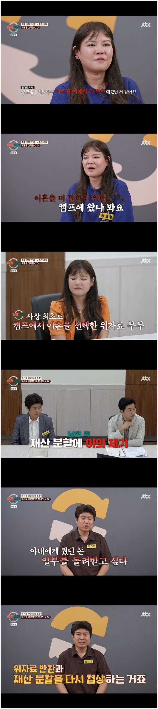 이성호 판사는 “이 캠프를 떠나면 부부로서 헤어지시는 거다”라면서 두 사람에게 대화할 기회를 주었다. 아내 강효정은 “끝까지 돈, 돈 치사하게 하는구나. 오만 정이 다 떨어지네요”라며 차분하게 마음을 눌렀고, 남편 김대기는 “할 말이 없습니다”라면서 “고맙지도 미안하지도 않더라. 사실 이혼을 하는데 재산도 분할을 하는데 좋겠냐. 지도 그러겠냐”라며 "천 만 원을 돌려받는다면 아버지께 드리겠다"라고 말했다.