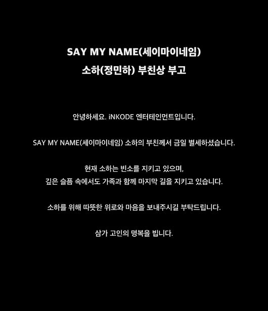 10일 소속사 인코드엔터테인먼트는 공식 SNS를 통해 세이마이네임 소하의 부친상 부고를 전했다.