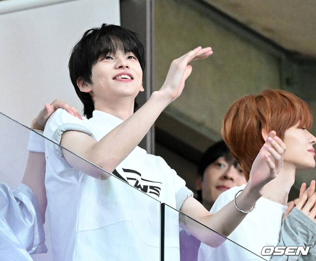 경기장을 찾은 그룹 투어스 신유가 응원을 하고 있다. 2025.10.10 /sunday@osen.co.kr