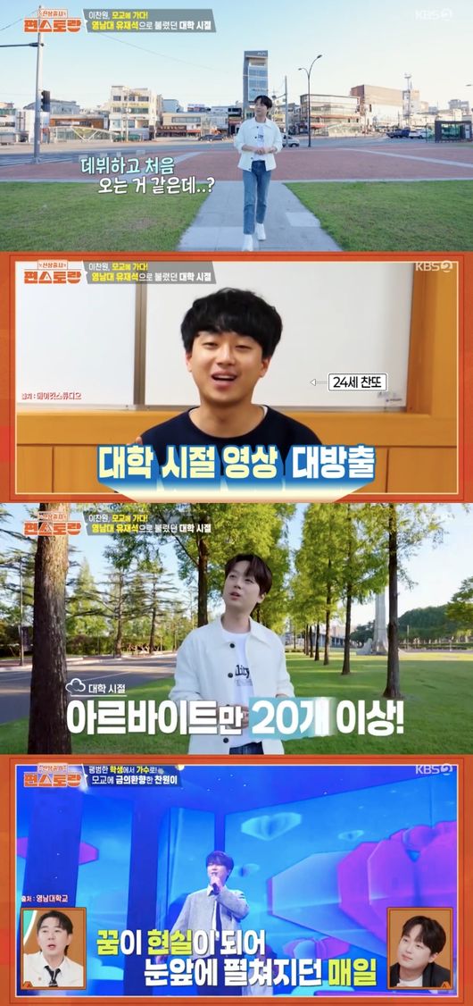 이날 모교 영남대를 찾은 이찬원은 “데뷔하고 처음 오는 것 같다”라며 대학시절을 떠올렸다. 온갖 축제를 휩쓸었다는 이찬원은 별명이 ‘영남대 유재석’이었다고.