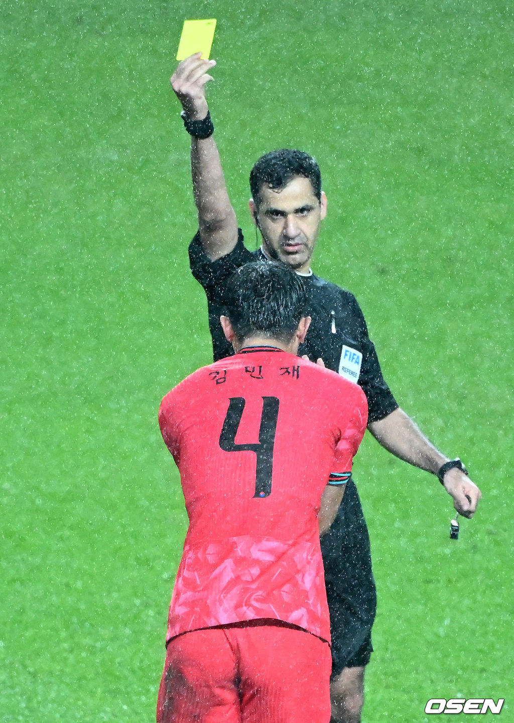 전반 반칙을 범한 한국 김민재가 옐로카드를 받고 있다. 2025.10.10 /sunday@osen.co.kr