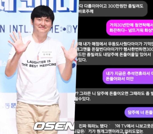 메시지에서 A씨는 "오랜만이다. 동창이다. 잘 지내냐"라며 인사를 건넨 뒤, 돌연 "다름이 아니라 300만 원만 좀 빌려달라. 다음 주에 바로 갚겠다"라고 금전 요구를 했다. 이에 김대범은 “거의 30년 만에 처음 연락해서 300만 원을 빌려달라는 건 좀 많이 화끈하네. 넘 뜨거워 화상 입겠다”라며 당황함을 표한 것.
