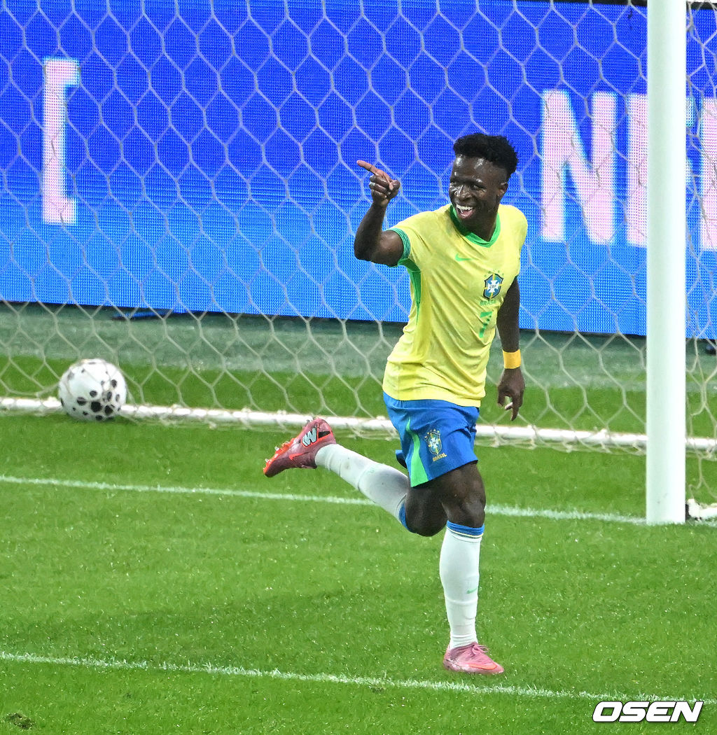후반 브라질 비니시우스가 팀의 다섯번째 골을 성공시키고 환호하고 있다. 2025.10.10 /sunday@osen.co.kr