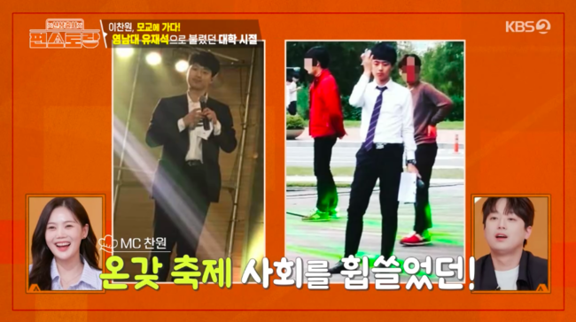 또 “친구들이랑 어울려 노는 거 좋아했다. 다른과 학생들이랑도 다 친했다”라며 대학시절을 떠올렸다. 열심히 생활한 만큼 이찬원은 온갖 축제를 휩쓸며 MC를 보고 다녔고 ‘영남대 유재석’이라는 별명까지 생겼다고.