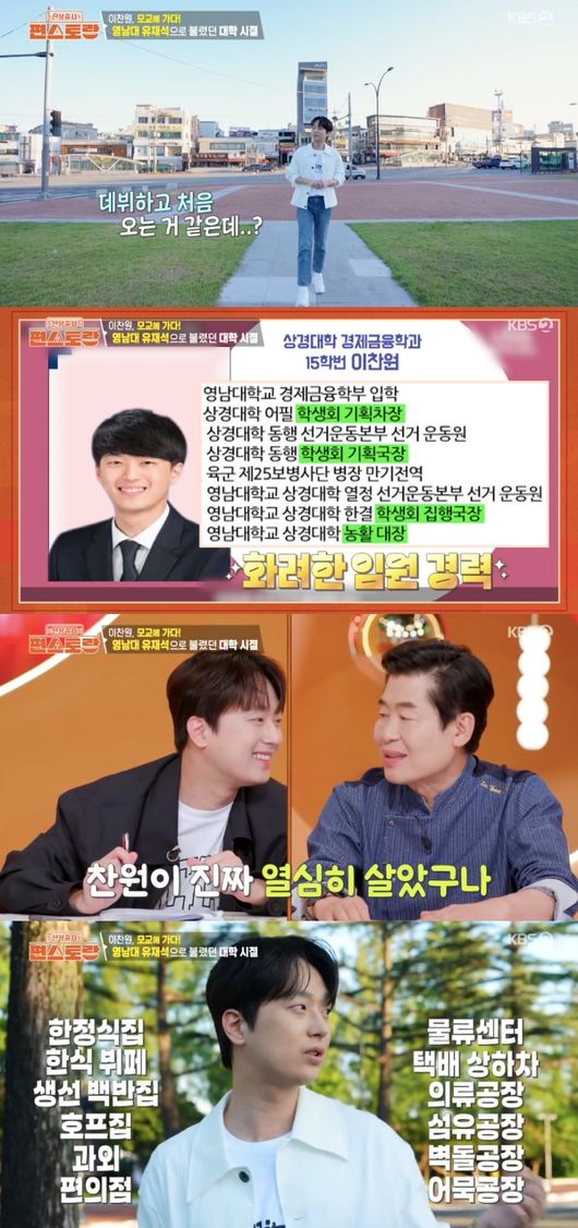 이날 이찬원은 “데뷔하고 처음 오는 것 같다”라며 모교 영남대를 찾았다. 이어 그는 “내 20대의 청춘이 고스란히 담겨있는 곳이다. 서울대 학교 다음으로 학교 부지가 넓다”라며 애정을 드러냈다.