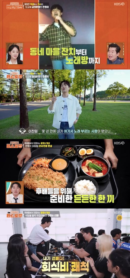 한편, 이찬원은 후배들을 위해 250인분 요리에 도전했다. 조리사분들의 도움을 받아 쌈장참깨마요 왕돈가스부터 우삼겹 된장찌개, 달걀부추짜박이, 상추나물 등을 완성해 눈길을 끌었다.
