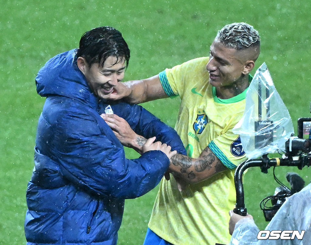 경기 종료 후 한국 손흥민이 브라질 히샬리송과 인사를 하고 있다. 2025.10.10 /sunday@osen.co.kr