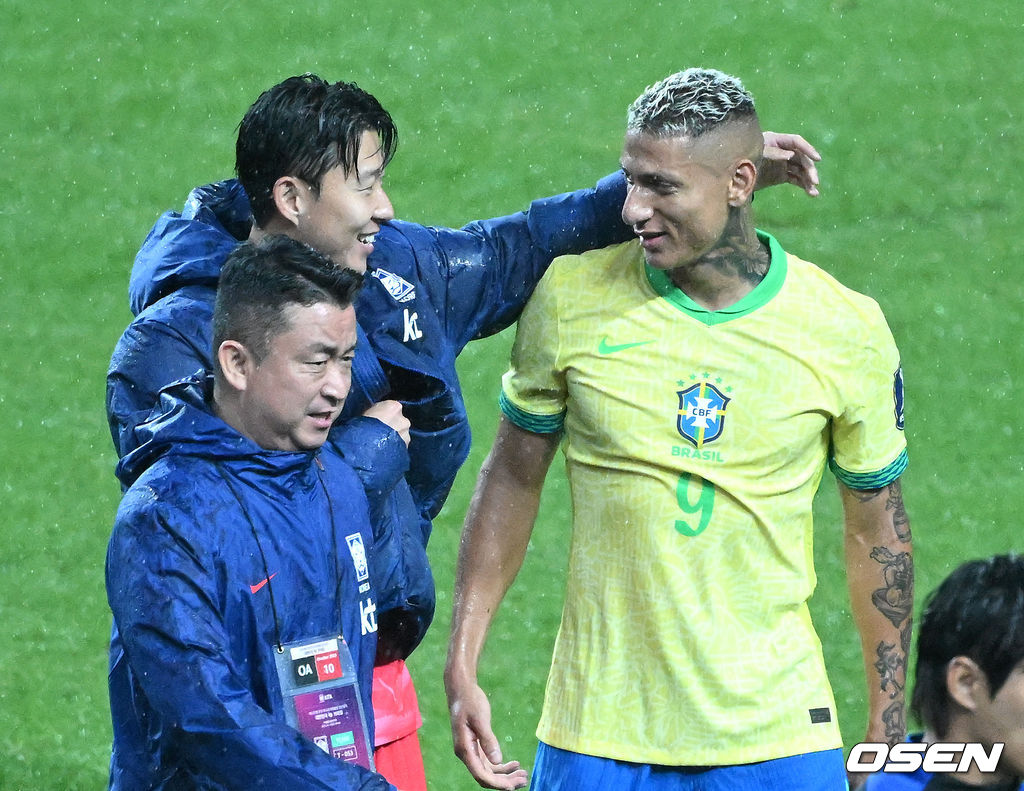 경기 종료 후 한국 손흥민이 브라질 히샬리송과 인사를 하고 있다. 2025.10.10 /sunday@osen.co.kr