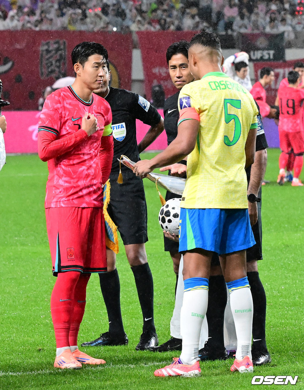 경기에 앞서 한국 손흥민과 브라질 카세미루가 진영을 선택하고 있다. 2025.10.10 /jpnews@osen.co.kr