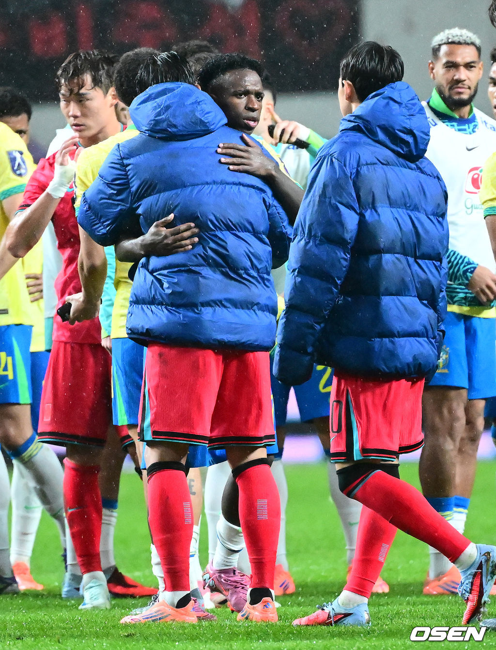경기를 마치고 한국 손흥민이 브라질 비니시우스 주니오르와 인사를 나누고 있다. 2025.10.10 /jpnews@osen.co.kr