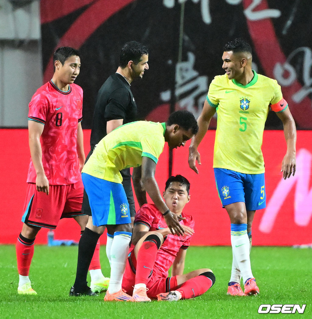 전반 한국 이강인이 브라질 카세미루의 태클에 걸려 넘어지고 있다. 2025.10.10 /jpnews@osen.co.kr