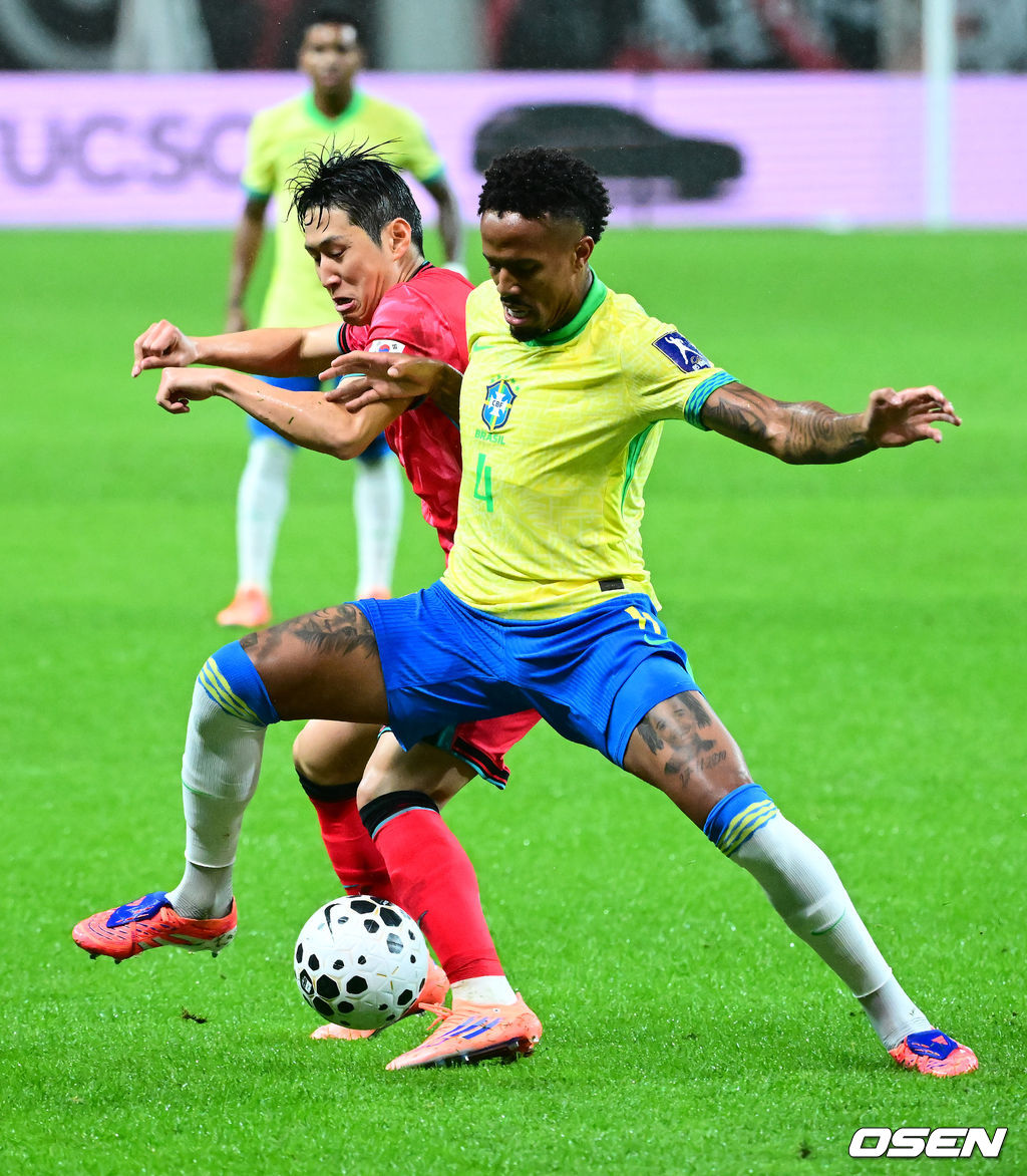 전반 한국 이강인이 브라질 에데르 밀리탕과 볼을 다투고 있다. 2025.10.10 /jpnews@osen.co.kr