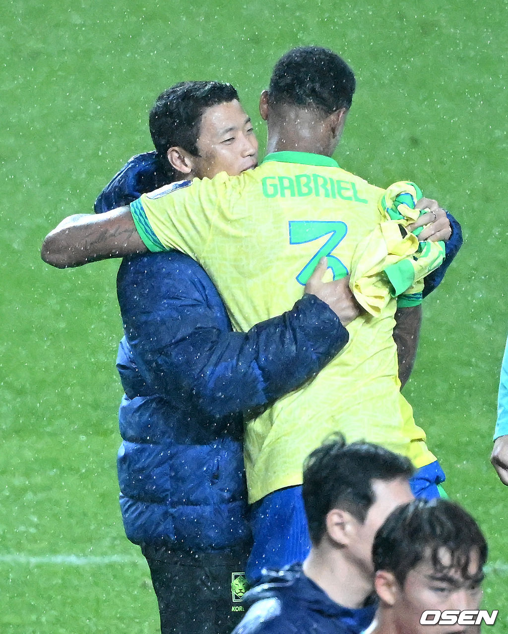 경기 종료 후 한국 황희찬이 브라질 가브리에우와 인사를 하고 있다. 2025.10.10 /sunday@osen.co.kr8u