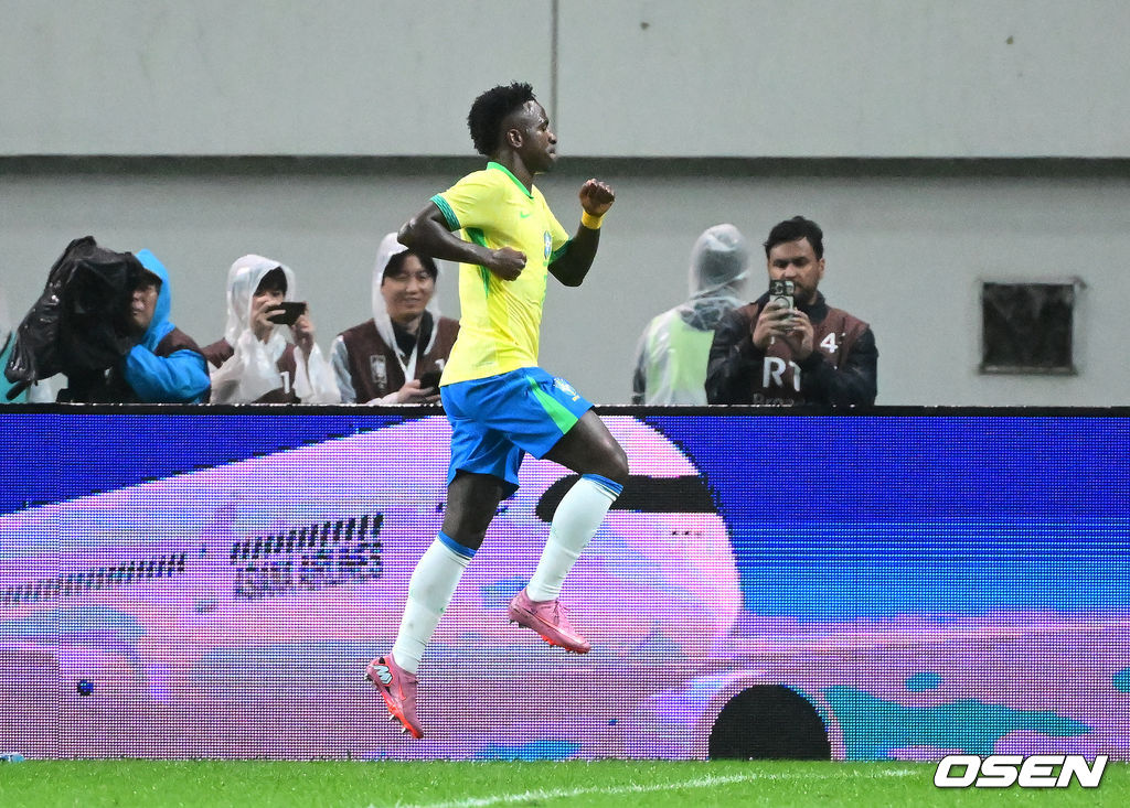 후반 브라질 비니시우스가 골을 성공시키고 환호하고 있다. 2025.10.10 /jpnews@osen.co.kr