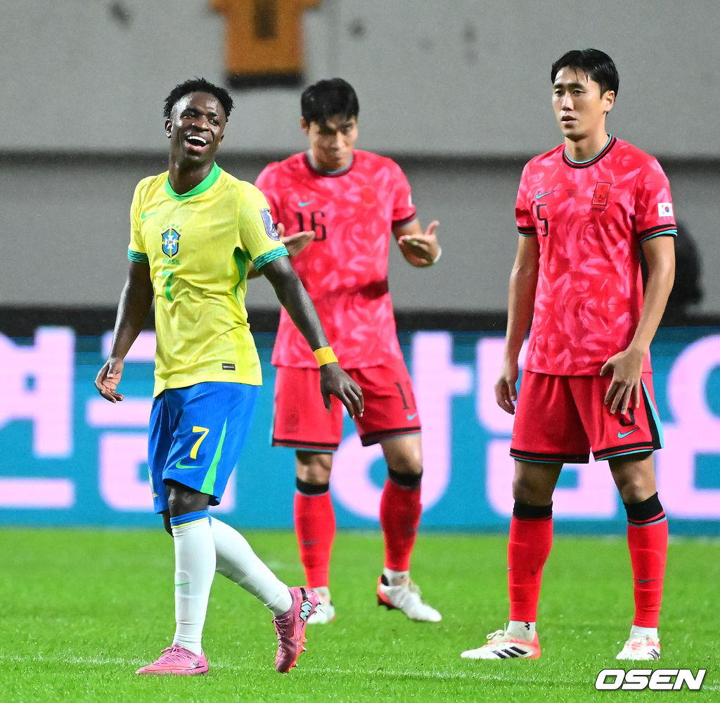 후반 브라질 비니시우스가 골을 성공시키고 미소짓고 있다. 2025.10.10 /jpnews@osen.co.kr