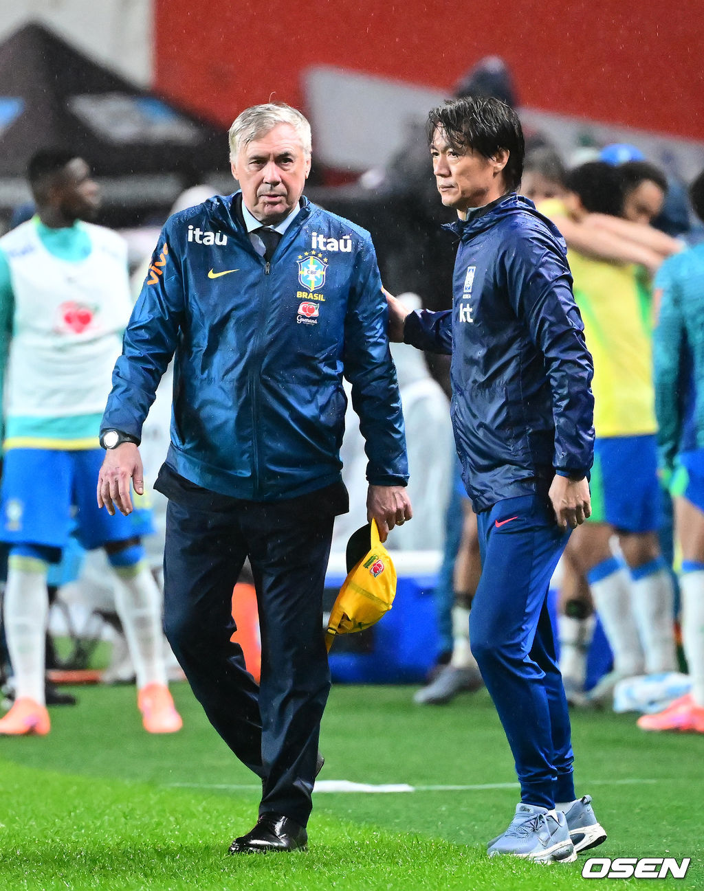 경기 종료 후 브라질 안첼로티 감독과 한국 홍명보 감독이 인사를 하고 있다. 2025.10.10 /jpnews@osen.co.kr