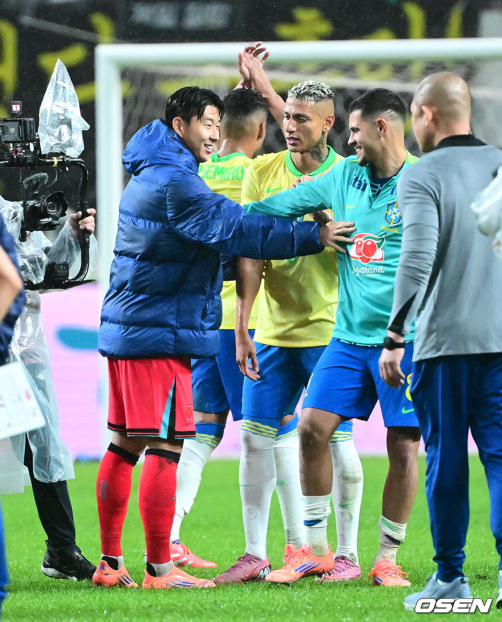 경기 종료 후 브라질 기마랑이스가 한국 손흥민과 인사를 하고 있다. 2025.10.10 /jpnews@osen.co.kr