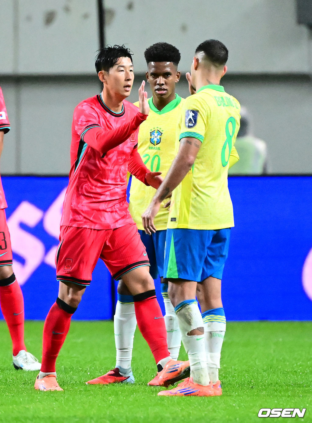후반 한국 손흥민이 교체되며 브라질 기마랑이스와 하이파이브를 하고 있다. 2025.10.10 /jpnews@osen.co.kr