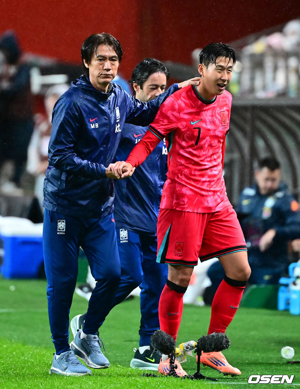 후반 홍명보 감독이 교체된 손흥민과 인사를 나누고 있다. 2025.10.10 /jpnews@osen.co.kr