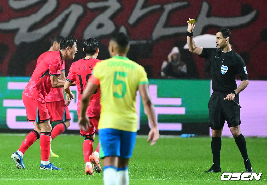 전반 한국 김민재가 파울 선언에 불만을 나타내고 있다. 2025.10.10 /jpnews@osen.co.kr