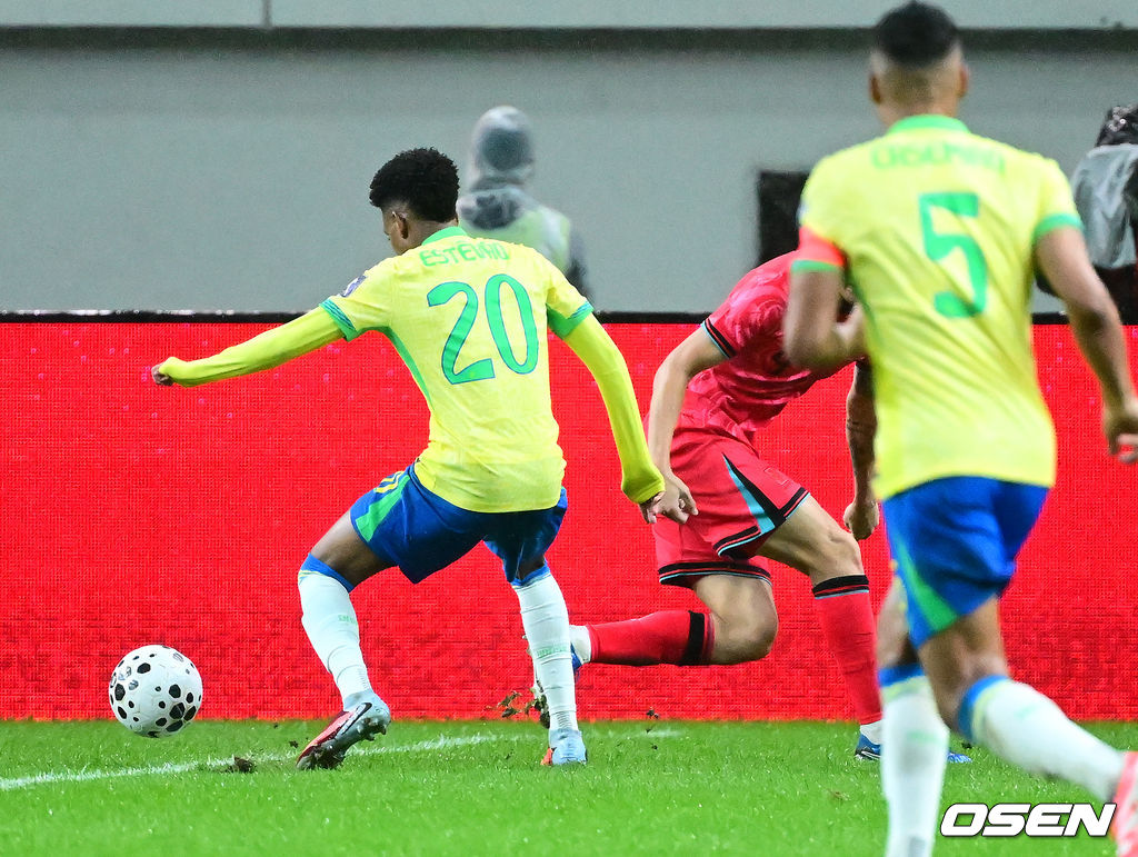 후반 브라질 이스테방이 한국 김민재의 볼을 빼앗고 있다. 2025.10.10 /jpnews@osen.co.kr