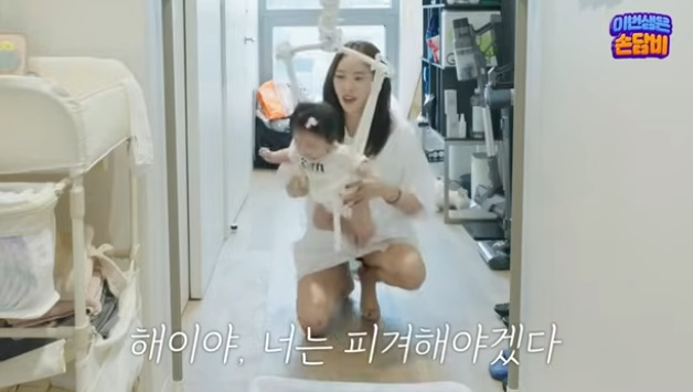 뿐만아니라 침대에 눕히려 하자 힘을 주고 버티는 해이를 보며 손담비는 "힘 센거 봐라. 미치겠다. 고개 봐라"라며 빠른 성장에 감탄을 표했다.
