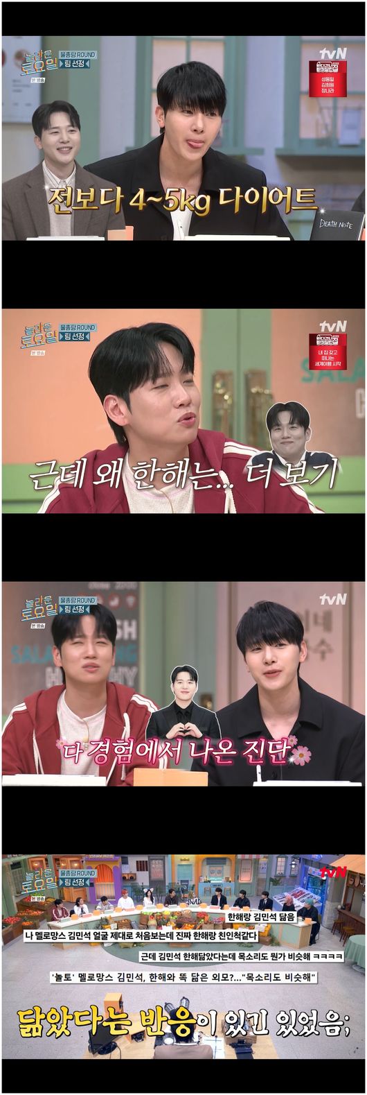 이어 놀토 두 번째 출연자인 김민석은 한층 핸섬해진 라인을 자랑했다. 김민석은 “4~5kg 뺐는데, 티가 난다”라며 부끄러워했다. 문세윤은 “되게 티가 나네”라며 격찬했다. 한해는 “어떻게 그렇지? 저는 10kg 넘게 뺐는데 별로 티가 안 나는데”라며 몹시 부러워했다. 김민석은 “그 전에 너무 많이 쪄 있으면 그럴 수도 있다”라며 조심스럽게 팩트를 언급해 한해를 상처 입혔다.