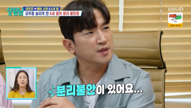 이민우는 "아내가 잠깐 음식 가지러 갔는데 아이가 울고불고 난리났다. 제가 너무 당황해서. 괜찮던 상황에서 저도 공황장애가 나와서 식은땀을 뻘뻘 흘린적 있다. 엄마 손에 많이 자랐지 않나. 아빠 손에 자라지도 못했고"라며 분리불안이 생길수밖에 없는 상황을 전했다.